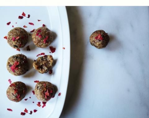 This recipe is very easy to put together with a food processor. Here are some prep notes: I like presoaking the nuts, which gives them a creamy texture and makes them easier to digest. Soak the cashews in water with a little sea salt for a few hours (no more than six hours or the texture and flavor will suffer). The almonds can be soaked the same way, for about 7 hours. If you’d like to store the nuts after soaking, place them on a baking sheet in a warm oven (no higher than 150° F) for 12-24 hours before keeping them in the refrigerator. If you don’t have time for soaking, skip it, but you might find that you need to use a little more water in the recipe. Also, the dates you choose should be moist and soft. Deglet and Medjool are my preferred varieties. I have a particular fondness for Medjools by Del Real Organic, which consistently have great flavor and texture. In my world, dates and roses are perfect partners, so the day I photographed the bites I garnished them with petals. Of course, rose petals are beautiful and they’ve also been used therapeutically across many cultures.